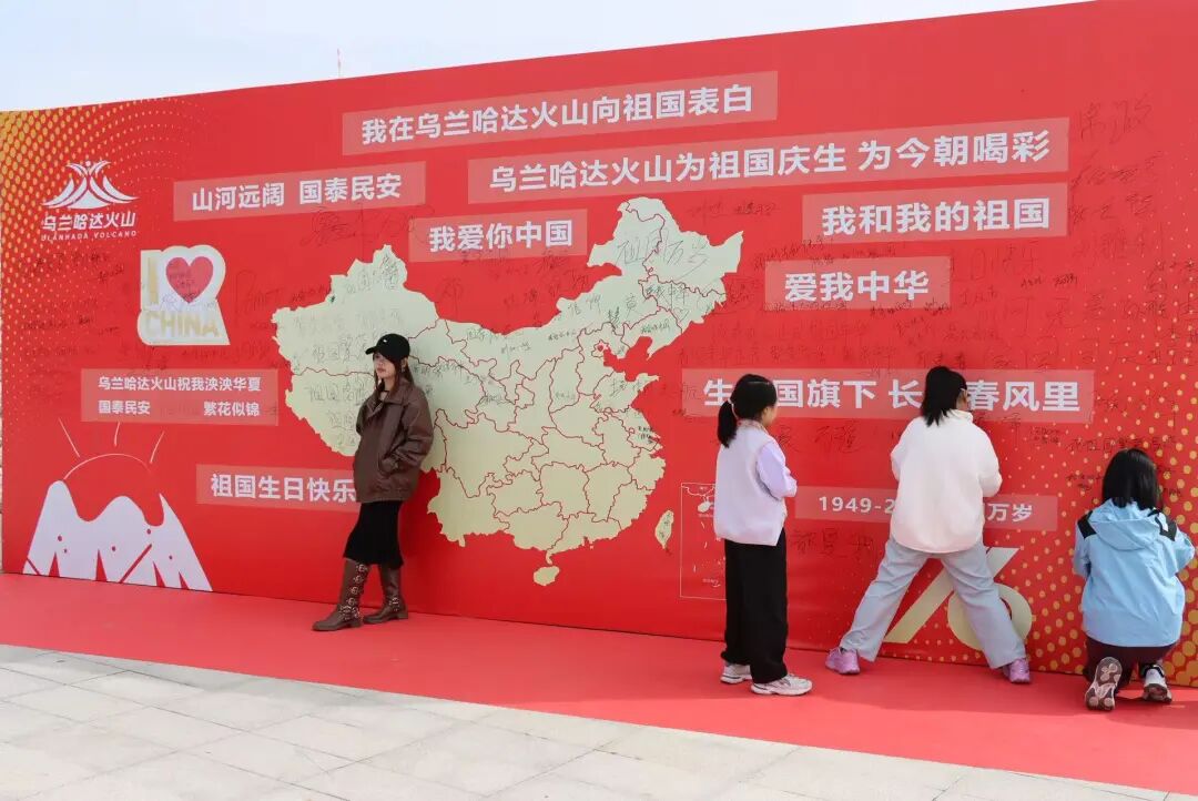 在南游客服务中心,蒙古族歌手身着传统服饰,将歌声与马头琴声融为一体,没有舞台,没有距离,只有歌声和心声的共鸣。家国寄语墙前人潮涌动,稚嫩笔迹与苍劲书法交错,字里行间满是对祖国的深情祝福,这里既是游客情感的寄托,更是火山脚下家国情怀的生动缩影。