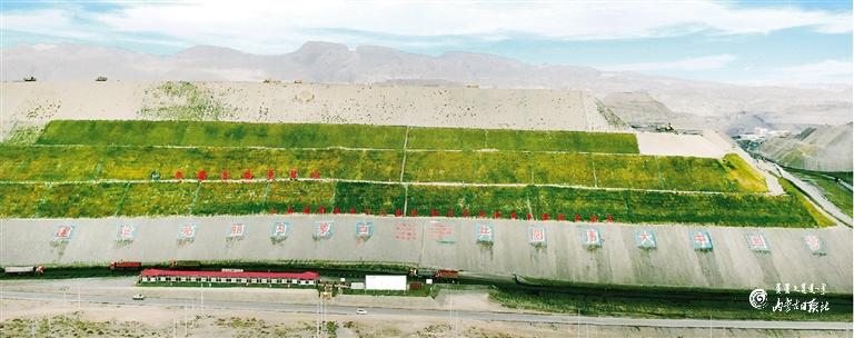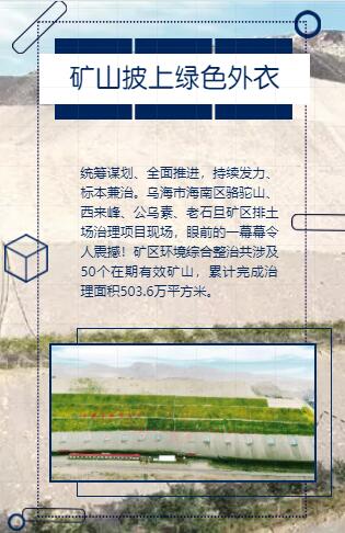 乌海市海南区骆驼山、西来峰、公乌素、老石旦矿区排土场治理项目现场,眼前的一幕幕令人震撼,一座座渣山已经告别了往日满目疮痍、千疮百孔的乱象,披上了齐整新装。放眼望去,巨大的渣山经过削坡、整形、覆土等工序已被固化,并呈阶梯形向上延伸,每一个坡面都被砖石沙袋分隔成网格状,矿渣已被重新覆土,并逐级向上种植了绿色植被,昔日的废弃渣山呈现出一派生机勃勃的景象。