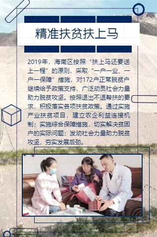 2019年,海南区按照“扶上马还要送上一程”的原则,采取“一户一业、一户一保障”措施,对172户正常脱贫户继续给予政策支持。