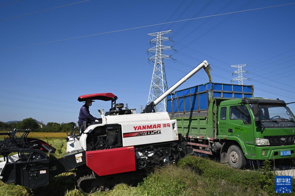 10月18日,湖州吴兴八里店镇尹家圩粮油植保农机专业合作社的农户操作收割机将稻谷装入转运的货车中。新华社记者 黄宗治 摄