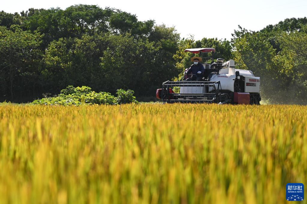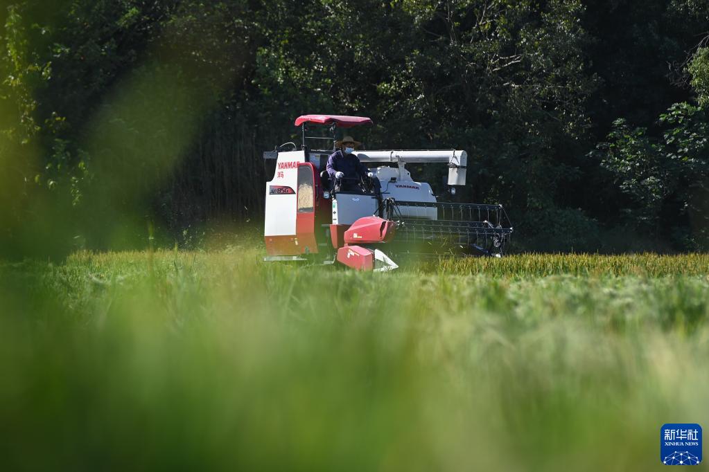 近日,浙江省湖州市吴兴区八里店镇种植的水稻迎来收获季节,农户操作收割机在稻田里作业,呈现一幅幅美丽的丰收图景。