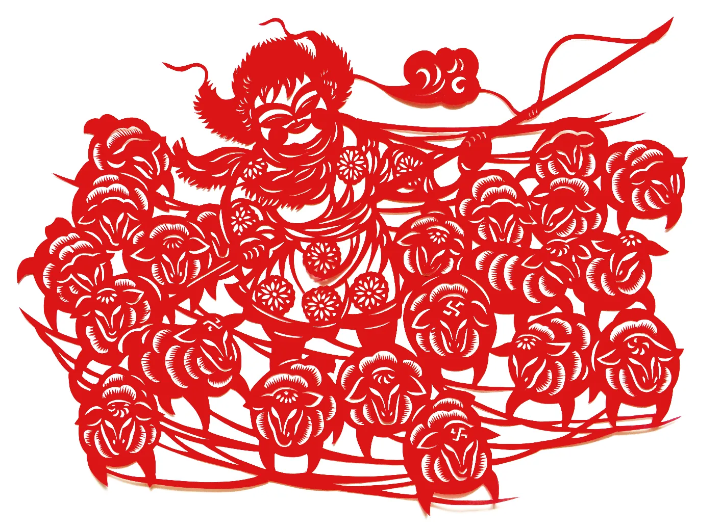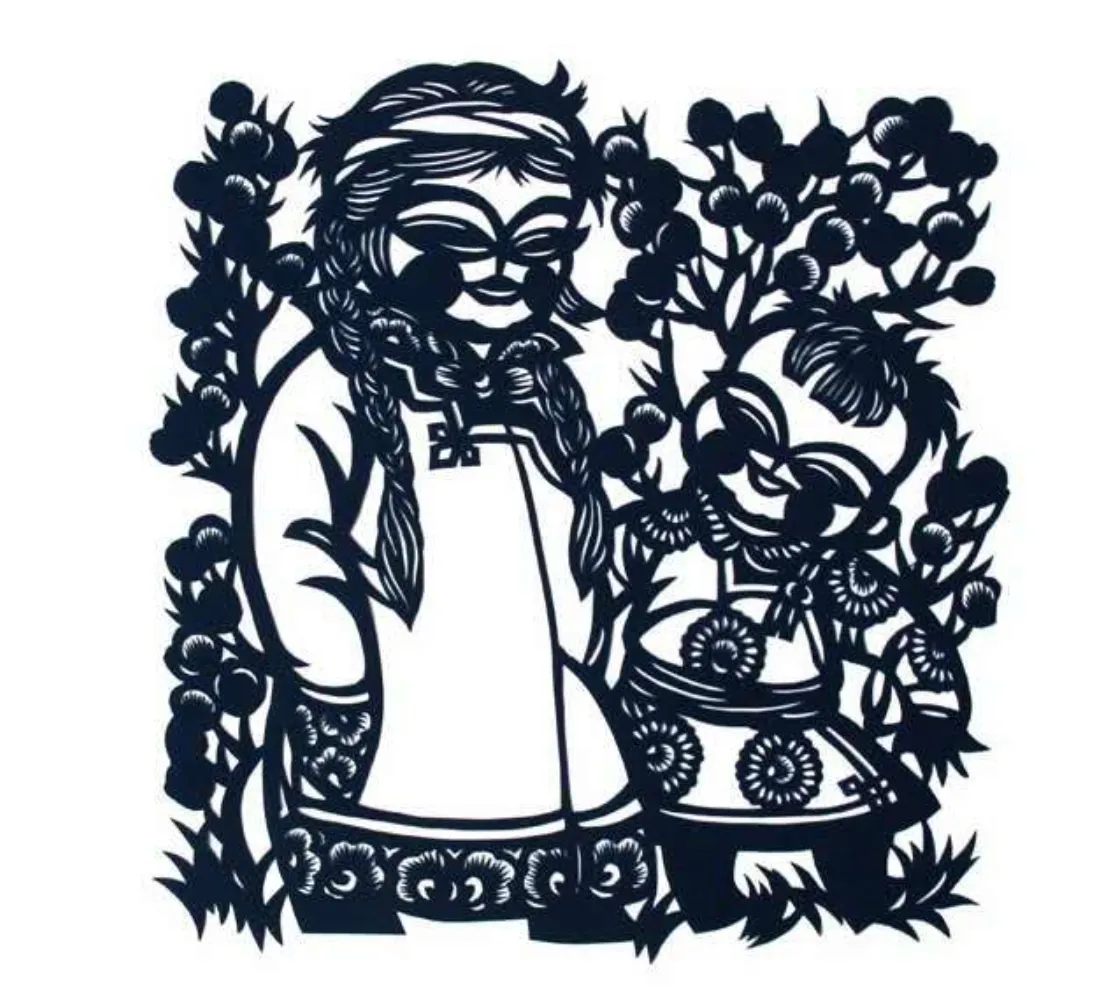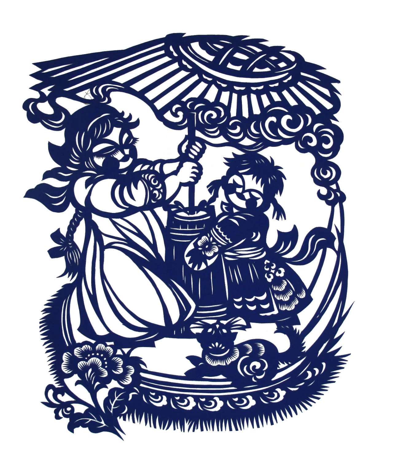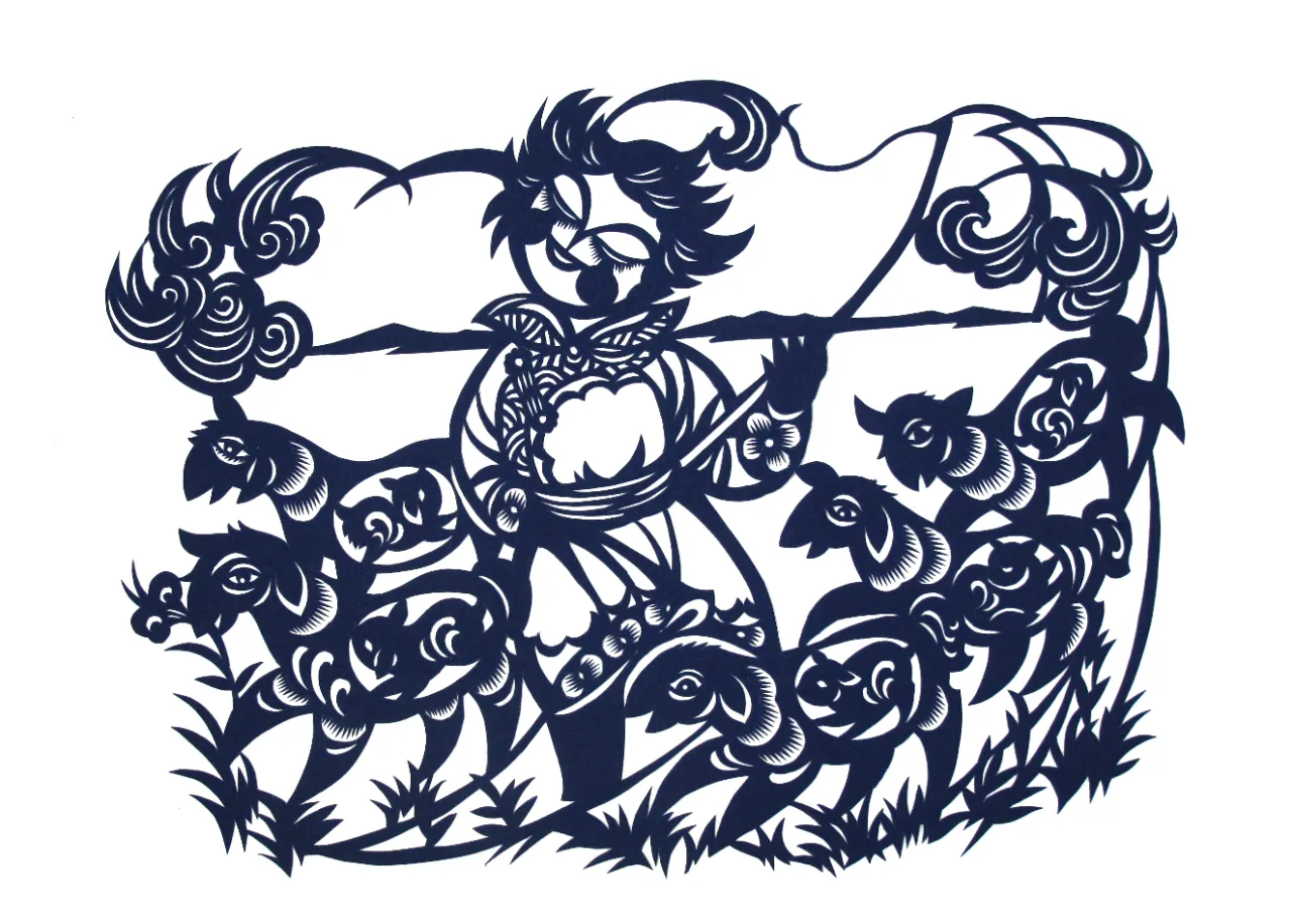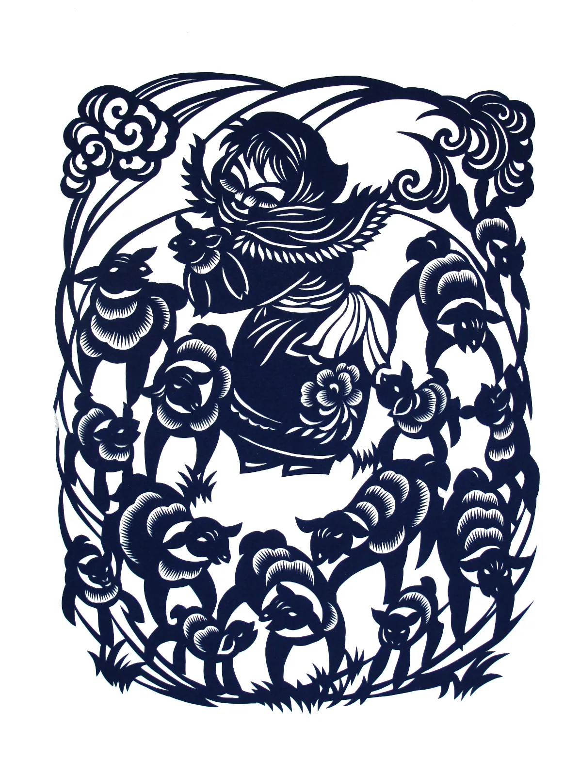 新华对草原生活细节的观察把握与道地再现,堪称惊艳:除大家感同身受耳熟能详的母亲、蒙古包、蒙古舞、马头琴、男儿三艺、放羊牧马等题材之外,接春羔、背雪篓、捣酸奶、拾牛粪、搓羊毛绳儿、赤脚医生等主题创作具有极强的代入感,对视之间仿佛已身在牧场草原。念念不忘,必有回响,此之谓也。剪纸方寸间,斗转星移乾坤尽览;留白深刻处,世道人心纤毫毕现。