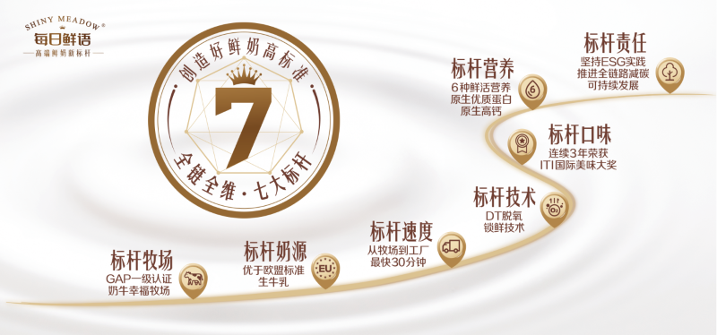 如果说具有流量密码的大IP和有竞争力的产品矩阵是每日鲜语打开市场的锋利之刃,那么不断升级的品质标准则是品牌持续立于潮头的根基。鲜奶竞争的核心,归根结底是品质的竞争。每日鲜语自创立之初便确立了“高端鲜奶新标杆”的品牌定位,并在2025年正式升维“创造好鲜奶高标准全链全维7大标杆”的品牌价值体系,从牧场到奶源,从技术到营养,从口味到责任,为行业树立起全方位的质量标准。
