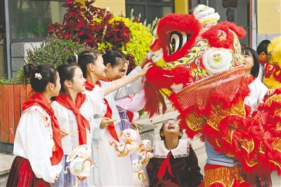 9月28日,呼和浩特市玉泉区清泉街小学表演舞狮的学生和同学们欢乐互动。中秋佳节将至,该校开展了“品味中秋民俗 传承节日文化”主题活动。活动中,同学们在老师的耐心指导下,学习制作月饼、拼装传统花灯、捏制兔儿爷等传统技艺,大家通过沉浸式体验中秋习俗,深度感受中华优秀传统文化的独特魅力。(王磊 摄)
