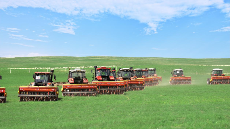草原免耕补播机正在作业,规模化机械队是打赢“三北”工程攻坚战的可靠支撑。