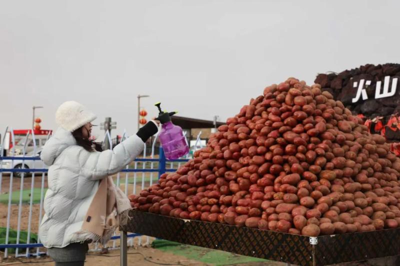 走进乌兰哈达火山3号山,工人们正紧锣密鼓地进行筹备工作。新建的游客休息区即将完工,而在火山脚下,工作人员正为即将亮相的特色美食——烤冻土豆反复“撒水养冻”。这种独特的制作工艺,是在极寒环境中将土豆浇水上冻,待其融化后挤干水分,再置于炉火中烤制。烤出的冻土豆口感厚实绵密,沙软香甜,撒上特制调料后更添风味层次,被游客誉为“火山蹦迪最佳CP”。