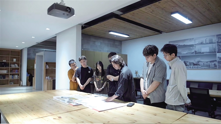 中国工程院院士、内蒙古工业大学教授张鹏举(右三)与学生设计方案。