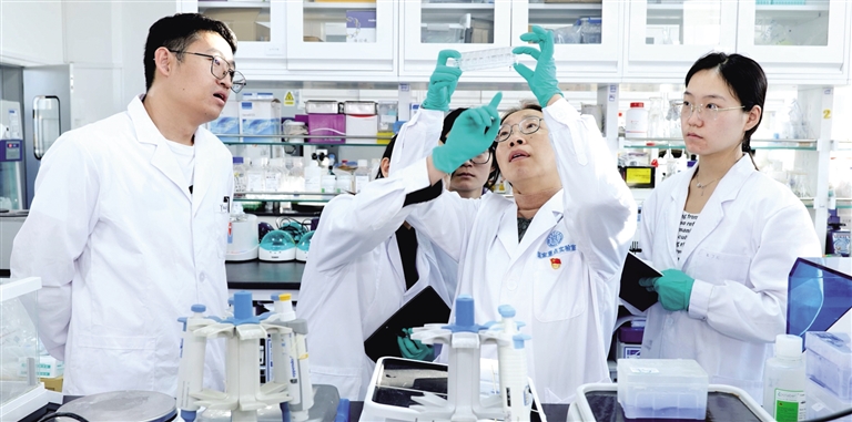 内蒙古大学胡薇教授团队在实验室讨论实验数据。