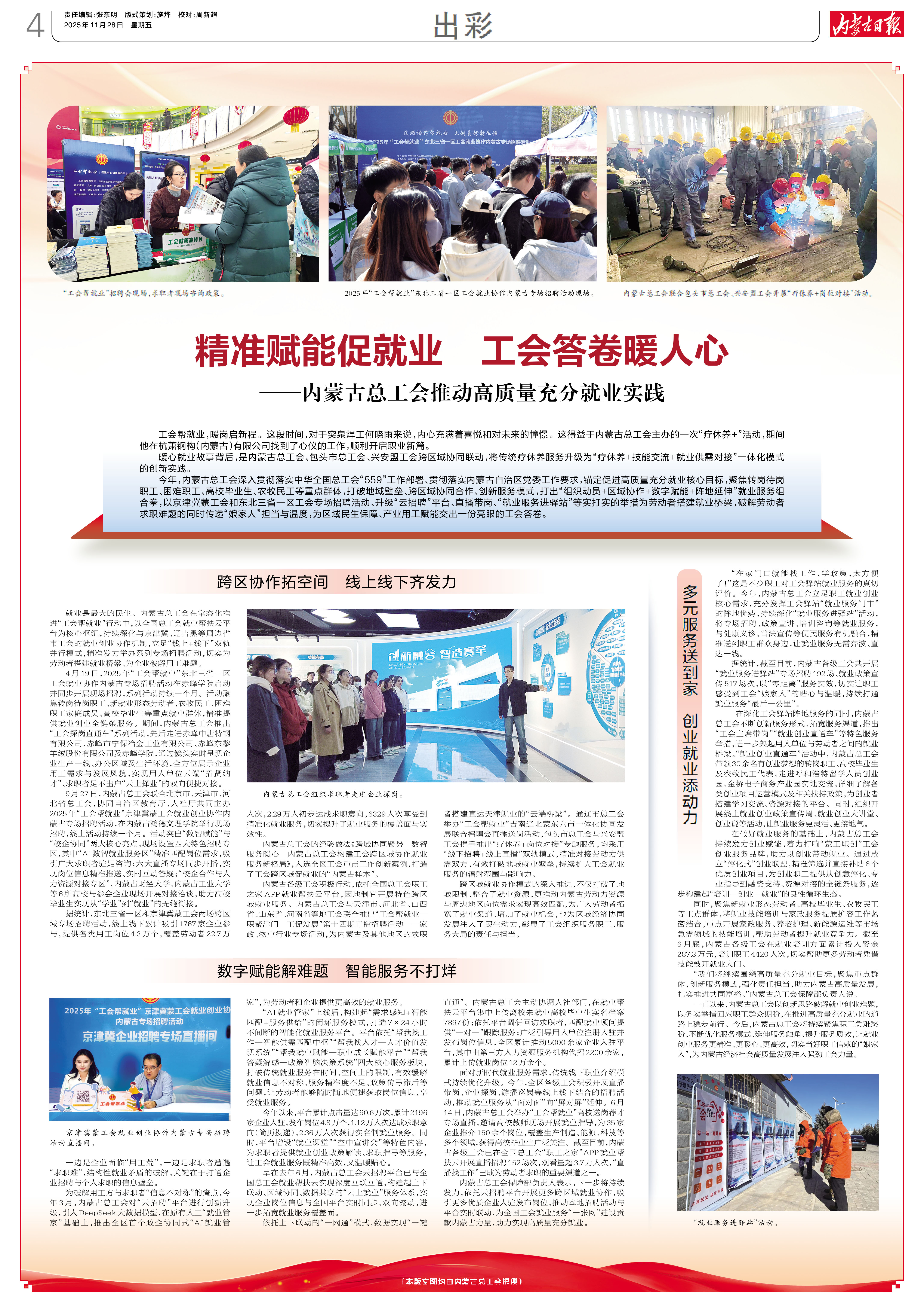 今年,内蒙古总工会深入贯彻落实中华全国总工会“559”工作部署、贯彻落实内蒙古自治区党委工作要求,锚定促进高质量充分就业核心目标,聚焦转岗待岗职工、困难职工、高校毕业生、农牧民工等重点群体,打破地域壁垒、跨区域协同合作、创新服务模式,打出“组织动员+区域协作+数字赋能+阵地延伸”就业服务组合拳,以京津冀蒙工会和东北三省一区工会专场招聘活动、升级“云招聘”平台、直播带岗、“就业服务进驿站”等实打实的举措为劳动者搭建就业桥梁,破解劳动者求职难题的同时传递“娘家人”担当与温度,为区域民生保障、产业用工赋能交出一份亮眼的工会答卷。