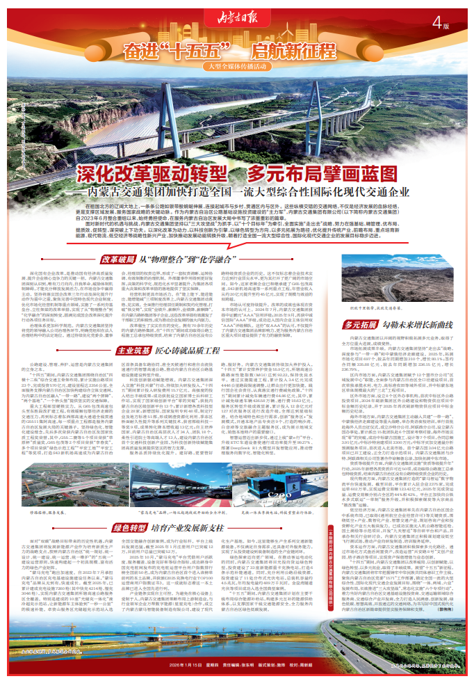“十四五”期间,内蒙古交通集团以改革破局、以创新赋能、以绿色转型、以多元拓业,取得了丰硕成果。展望“十五五”新征程,内蒙古交通集团将牢牢把握铸牢中华民族共同体意识工作主线,聚焦内蒙古自治区党委“1571”工作部署,锚定全国一流的大型综合性、国际化现代交通企业发展目标,围绕“一体、两域、六业”发展布局,长效推进“三大攻坚战”,常态化实施“六个专项行动”,着力当好内蒙古自治区交通基础设施投资商、交通运输领域综合服务商、交通综合产业开发商,全力打造人民满意、创新发展、绿色低碳、智慧高效、开放通达的交通网络,为书写好中国式现代化内蒙古自治区新篇章提供坚实服务保障和支撑。(郭伟伟 图片由内蒙古交通集团有限公司提供)