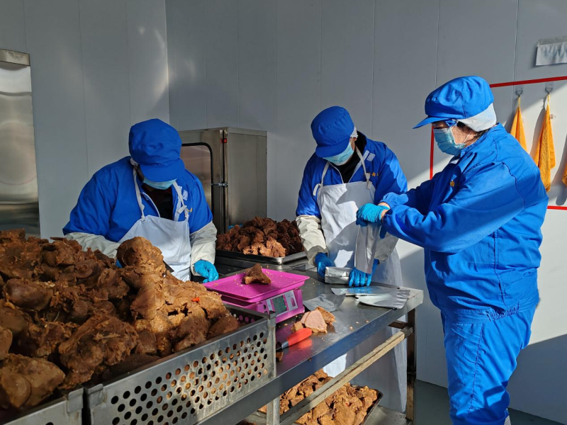 走进凉城县华珍特种养殖草牧业开发有限责任公司鹿肉珍品的生产加工车间,醇厚的肉香裹挟着秘制卤香扑面而来,工人们在各道工序前忙碌不停。经滚揉入味、慢火蒸煮色香味俱佳的精选鹿肉,被工人们分割包装、真空锁鲜,再经无菌传递与高温杀菌,最终封装成多款礼盒走向市场。