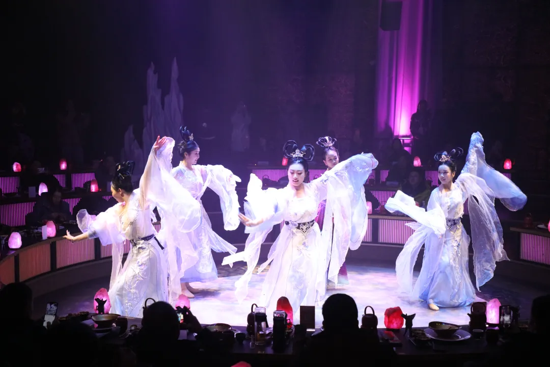 在南游客服务中心,《乌兰察布之约——梦回火山》精彩上演,以跨越时空的叙事,带领观众深入乌兰察布的历史脉络与火山传奇。导演组执行导演李瓖介绍:“我们打造了沉浸式用餐观演空间,通过舞美、舞台与演员的精密配合,反复磨合走位与设备衔接,使演出与餐饮体验深度融合。餐秀以‘六世情缘’为主线,融合察哈尔民俗与火山文化,借助数字技术营造沉浸氛围,让游客在品味美食的同时,身临其境感受当地的文化故事。”