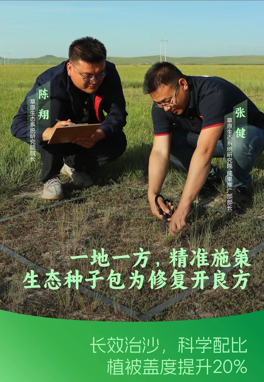 “种子包的关键在于‘一地一方’的定制配比。” 陈翔表示,为了找到最佳的配比,科研团队在不同地区开展了无数次区块评比,在浑善达克沙地,用种子包修复第2年植被盖度就达到65%。在扎赉特草原,植被盖度从57%提升至80%,干草产量增加70%,优良牧草干重翻1.3倍。
