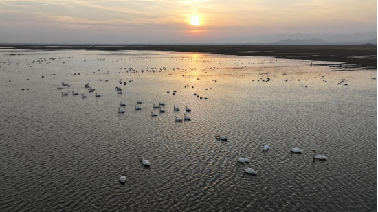 夕阳垂落,金色霞光铺满岱海湿地的水面,一只只雪白的天鹅悠然自得地浮在水面上,展翅迎风。它们时而潜入水中低头觅食;时而凑到一起互相嬉戏;时而扇动双翅,踏浪而行。优雅的身姿与低徊盘旋的野鸭、大雁交织构成一幅美丽和谐的生态画卷,为岱海自然保护区增添了无限生机与活力。